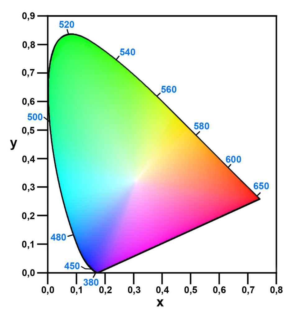 CIE 1931 Chromaticity Diagram showing high dynamic range of human light perception.
