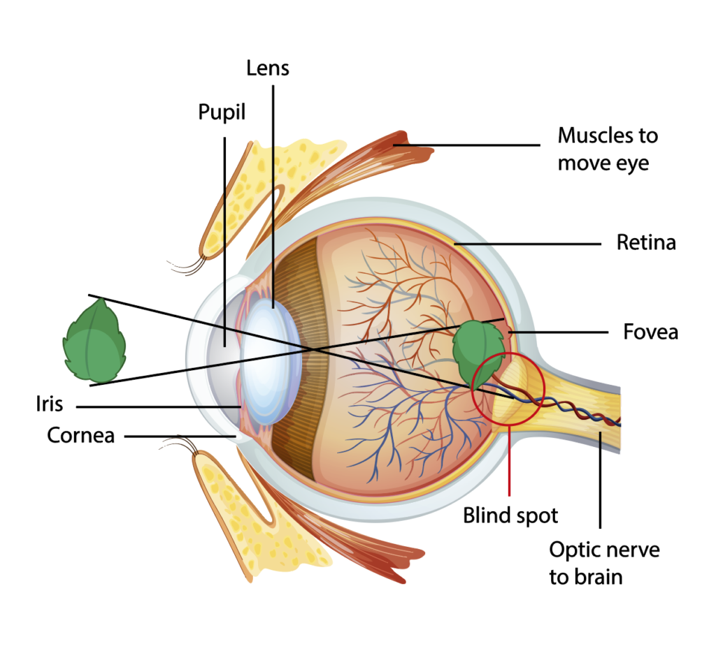 Let’s now dive into how our eyes perceive light. Particles of light enter our eyes through the cornea and end up on the macula in the back. Within the macula is the fovea, which contains a very high concentration of optic receptors. The fovea allows us to recognize details such as those required for reading, for example. The mass properties of light rays are transformed into electrical signals by the fovea, which is how we’re able to see those details.